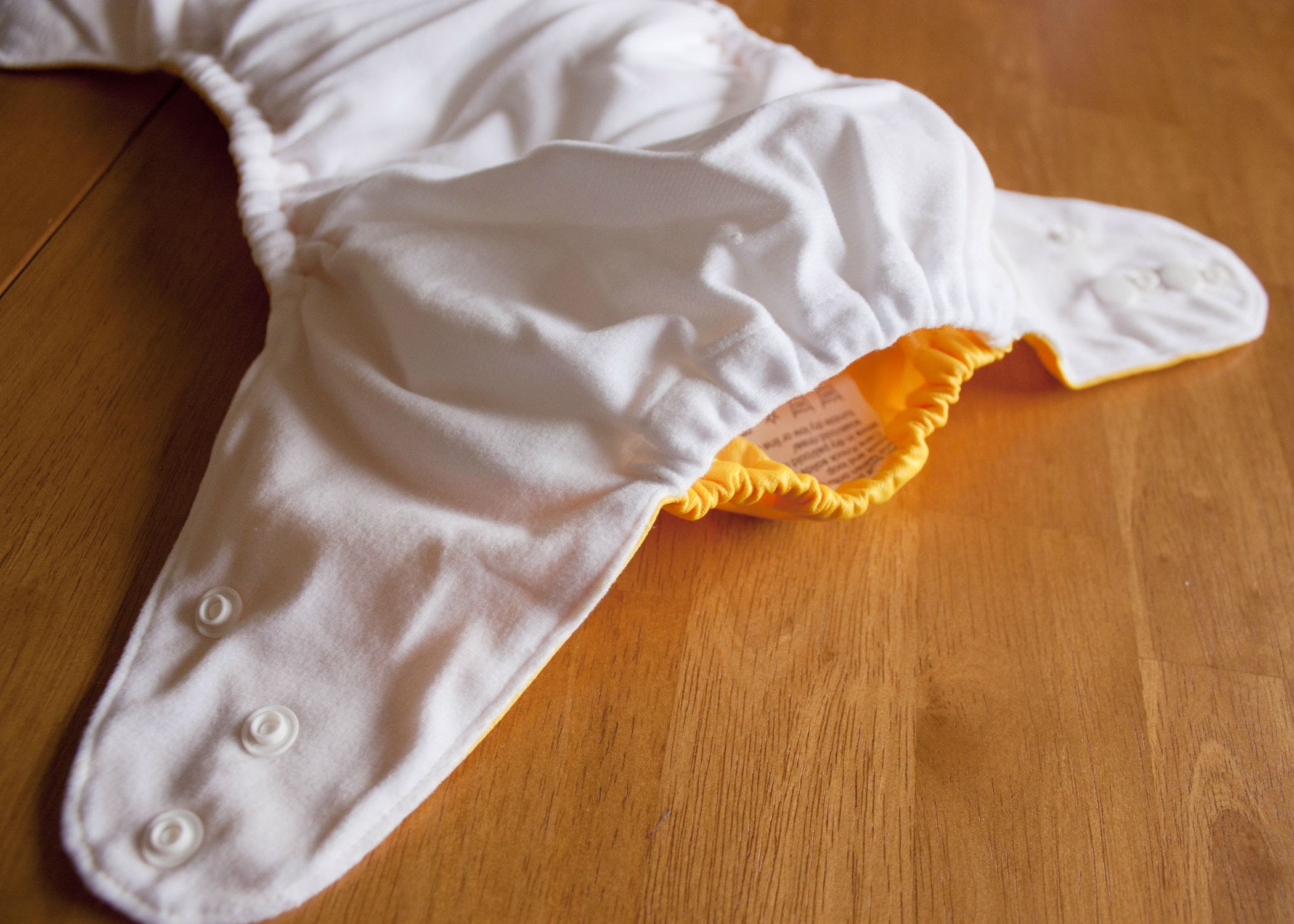This your typical 3.0 pocket diaper. Three rise settings, a hip snap, two upper snaps, with snaps on the flap in case you have a super skinny baby. The pocket opening is in the back, with elastic on both the waterproof outer and inner suedecloth layer. (See yellow diaper below.) This one came with a single microfiber insert.